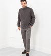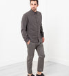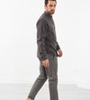 The Baldo by Pence incorporates a unique micro pattern in the modern silhouette. Hook and eye closure with single button, zip fly at front. Four exterior pockets. Color Grey. 88% Cotton, 9% Polyester, 3% Elastane. Made in Romania. Jacob is wearing an Italian 48.